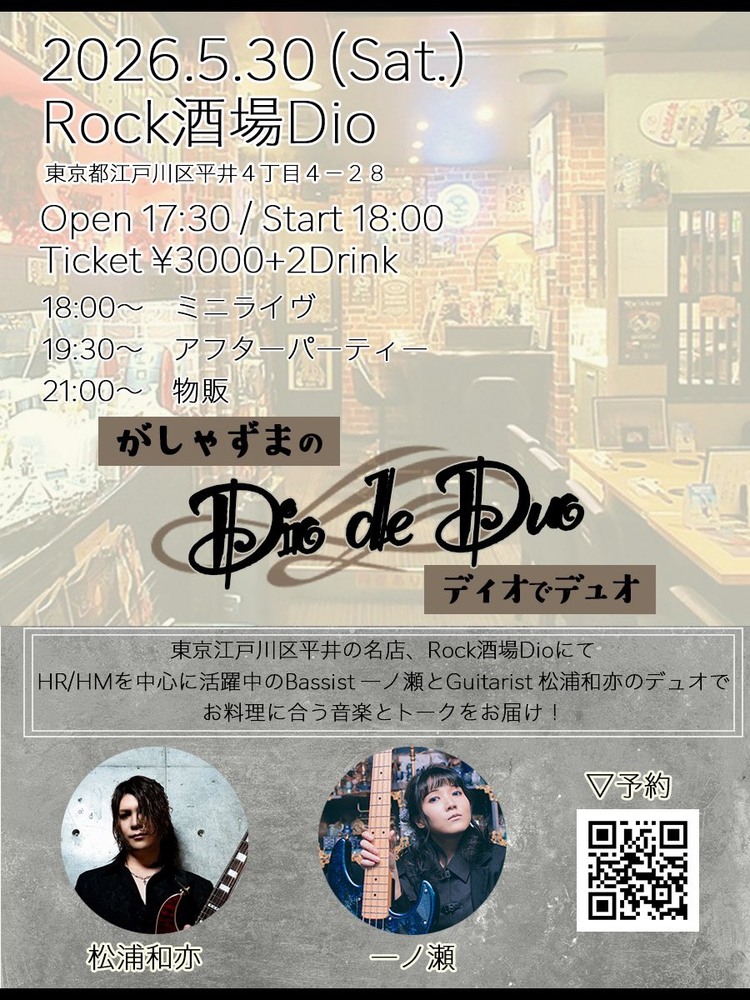 東京都江戸川区の名店「Rock酒場Dio」にてHR/HMを中心に活躍中の松浦和亦(Gt)と一ノ瀬(Ba)のデュオでお料理に合う音楽とトークをお届けします!